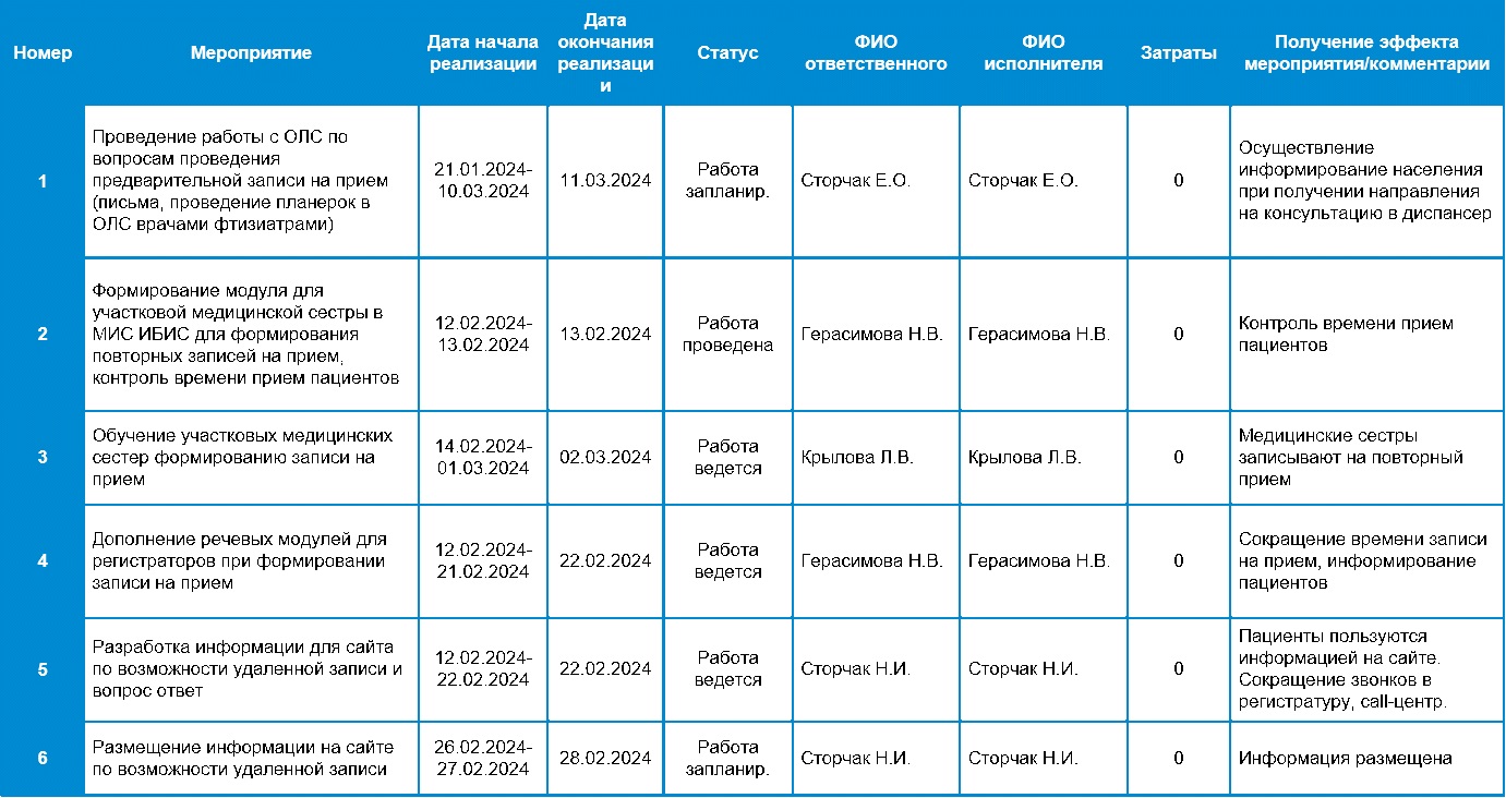 В рамках Проекта «Работа регистратуры медицинской организации: предварительная запись на прием к врачу (через интернет, по телефону, при обращении в регистратуру)» «Сургутским клиническим противотуберкулезным диспансером», продолжаем знакомить с реализацией проекта. Составлен план мероприятий по достижению целей, распределены роли и сроки проведения мероприятий.